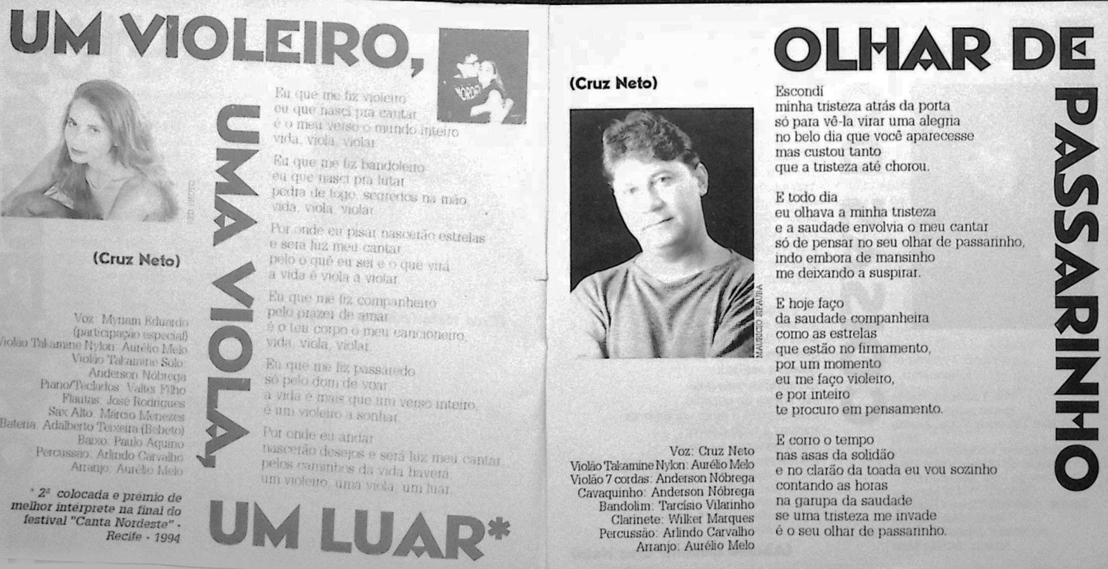 Com Geraldo e Laurenice, fez seu primeiro show (“Canto Amordaçado”), que, de um tanto quanto distante no tempo e na memória, já não se registra como data na cabeça de Cruz Neto, mas que foi importante como um divisor de águas, que o levaram a compor muita coisa, a voltar aos festivais, como se deu em 1994, quando sua música “Um violeiro, uma viola, um luar”, defendida por Myriam Eduardo, ficou em segundo lugar e recebeu o prêmio de melhor intérprete no final do festival Canta Nordeste, da Rede Globo de Televisão.