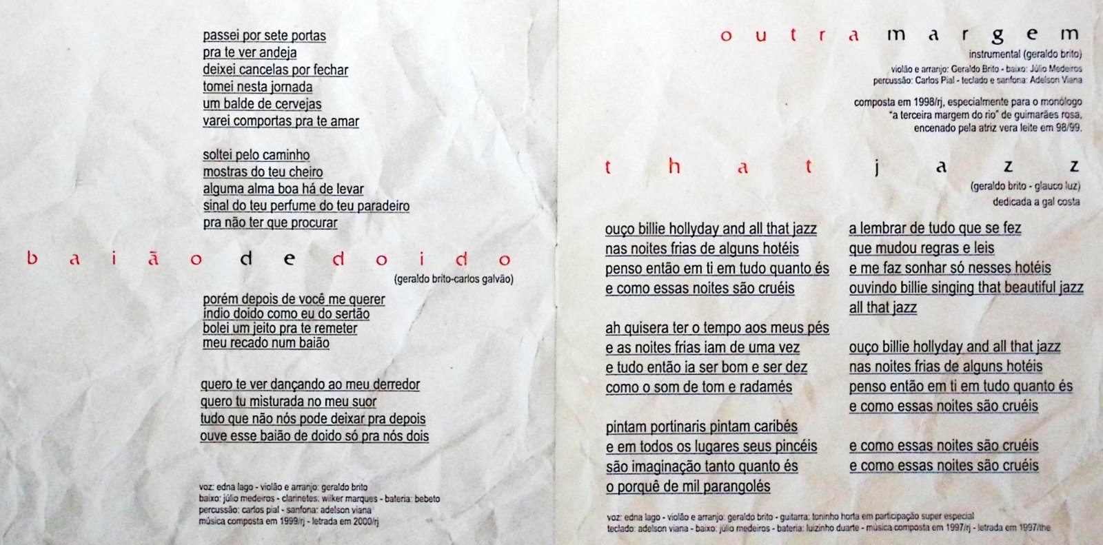 Na trajetória de compor, há ainda o espaço de caminhada junto aos nomes que o inspiram. Geraldo cita entre compositores que admira e o inspiram aqueles que define como quarteto fantástico de sua vida: Chico Buarque, Caetano Veloso, Gilberto Gil e Tom Jobim, “pilares de boa parte do meu trabalho”, nos quais busca um retorno, segue a trilha estética, acompanha a maneira como compõem. Tudo isso faz com que tenha deles muito em suas canções, que não têm a ver com a deles, mas seguem uma estrutura próxima do que eles fazem.